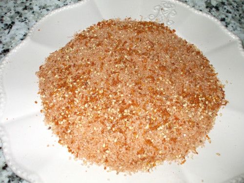 Ponemos todos los ingredientes en el mortero, machacamos hasta conseguir el grosor deseado. Extendemos en un plato y dejamos unas horas hasta que se halla secado y la ponemos en un salero.