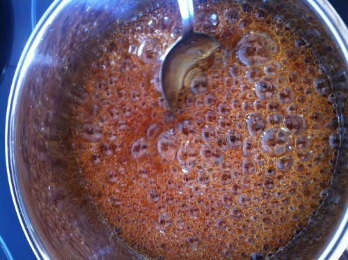 En un cazo colocamos el agua y la fructosa para hacer el caramelo, lo haremos a fuego bajo y removiendo continuamente hasta lograr un melado y a continuación una mezcla de color marrón.En este proceso tardaremos un tiempo considerable. Cuando esté listo lo verteremos en el molde de forma que se extienda por toda la base.