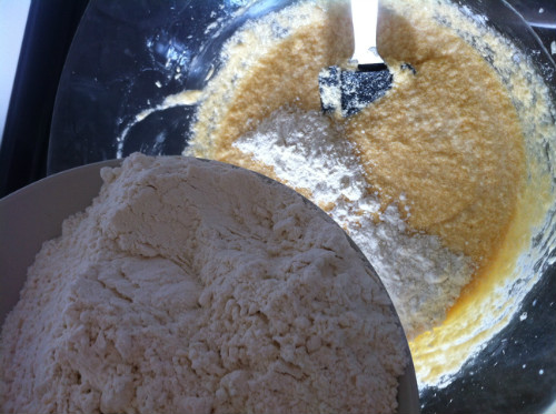 En un recipiente colocamos la margarina y la mantequilla y la batimos hasta obtener una mezcla homogénea, momento en el que añadiremos la fructosa y seguimos batiendo para intregarla. Una vez hecho esto iremos añadiendo los huevos uno a uno a medida que continuamos batiendo, y luego el vodka y la vainilla.