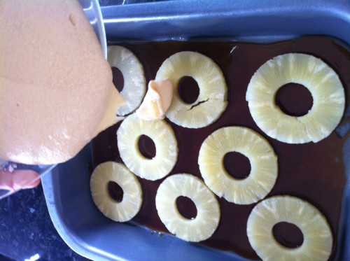 En el molde que habíamos reservado, colocaremos las rodajas de piña, las cuales han sido previamente escurridas gracias a un papel absorbente.