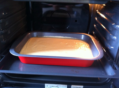 Metemos el molde en el horno, ya precalentado, durante unos 45 minutos a 175ºC. Comprobaremos que está lista cuando, al introducir un palillo en ésta, salga seco.