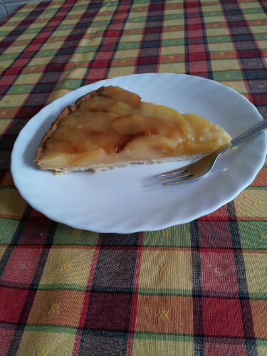 Vertemos el puré en el hojaldre y colocamos las láminas de manzana encima, lo pintamos con el puré licuado anteriormente y lo ponemos en la nevera durante 5h y listo para servir. (Mejor dejarla de un día para otro)