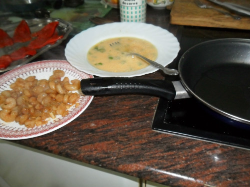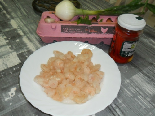 preparar los ingredientes, si las gambas son congeladas, descongelarlas y escurrirlas