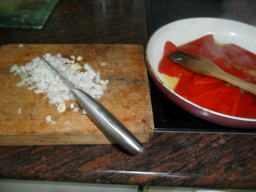 poner una cucharada de aceite en una sartén, y poner los pimientos que se tuesten un poco, de mientras picar finamente el ajo y la cebolleta