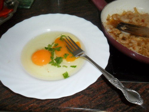 sacar los pimientos y colocar en una bandeja, añadir la otra cucharada de aceite y saltear las gambas, mientras se saltean, se ponen en un plato los dos huevos y el perejil y se baten