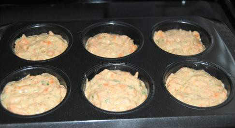 Engrasa los moldes para muffins con un poco de aceite de oliva y vierte el preparado dejando un dedo aproximadamente para darle espacio cuando suban durante el horneado.