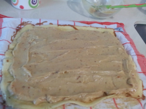 Extender encima de la plancha de bizcocho y enrollar con cuidado.