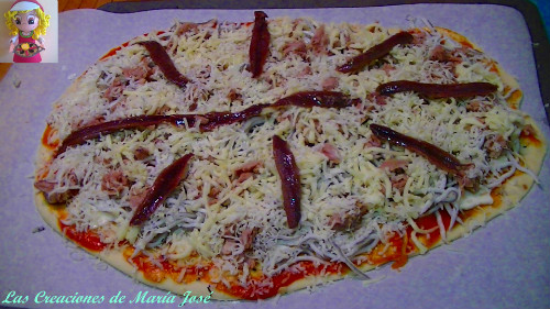 Yo la masa la hice en la panificadora en el programa 9 de pizza. Si no tenéis panificadora ir mezclando los ingredientes poco a poco y cuando ya no se os pegue en las manos dejarlo reposar 2 horas. Extendéis la masa con un rodillo dejar 20 minutos de reposo. Después de los 20 minutos untarla con tomate, echar las gulas, el atún, el queso rallado y decorar la pizza con anchoas. Meter al horno a 200º unos 25 minutos, depende de cada horno.