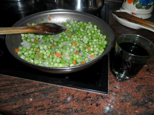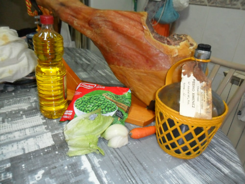 preparar los ingredientes, los guisantes pueden ser frescos o congelados, a mí personalmente me gustan los congelados de findus que tienen un tamaño fina, si no hay cogollo de lechuga, usar el centro de una lechuga tierna, y se puede usar cualquier vino dulce, a mí me gusta el de Pedro Ximenez