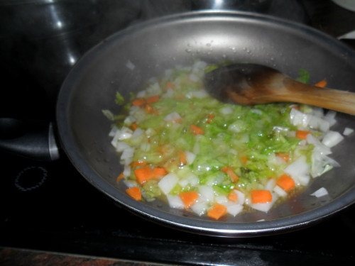 poner a calentar el aceite de oliva en una sartén y de mientras cortar finamente la cebolleta, la zanahoria y la lechuga