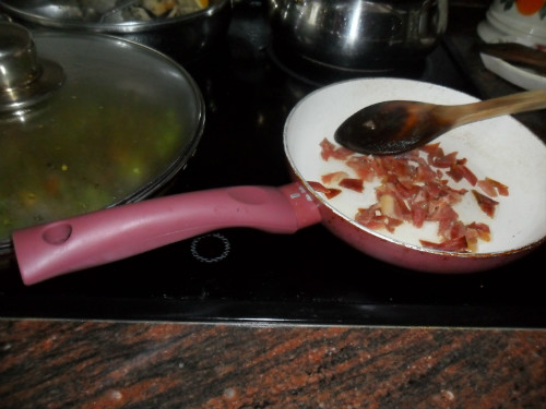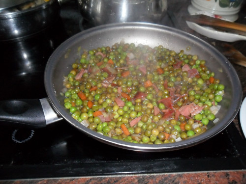 añadir los guisantes y mezclarlos con las verduras, echar la copita de vino y tapar , tener a fuego medio 10 minutos, de mientras cortar el jamón a taquitos