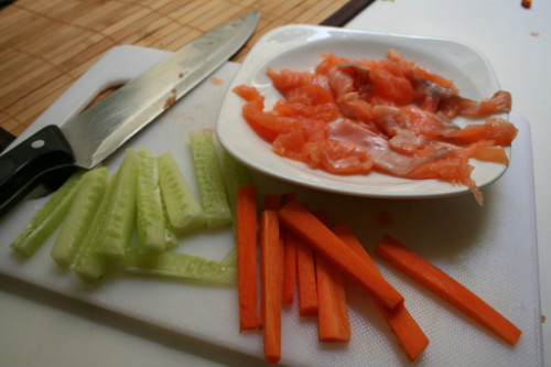 Mientras se hace el arroz, cortamos los ingredientes en tiras de unos 5-6 cm de largo y 1 cm de grosor y reservamos. Calentamos un poco el vinagre de arroz y disolvemos dentro el azúcar y la sal.
