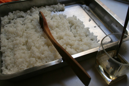 En una bandeja o superficie plana, preferiblemente de madera, extendemos el arroz, que ya estará cocido y listo. Iremos mojando los dedos en un cuenco con agua para evitar que el arroz se pegue a nuestros dedos. Dejamos que se enfríe y, con una pala de madera, hacemos surcos en el arroz mientras lo regamos poco a poco con el vinagre caliente.