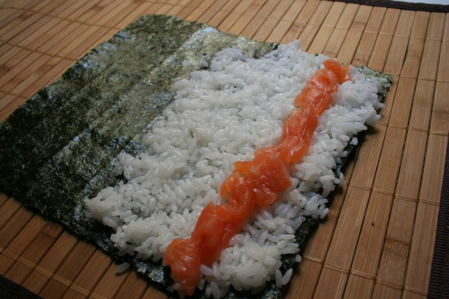 Cuando el arroz esté frío, colocamos una hoja de alga nori sobre la esterilla de bambú. La parte rugosa boca arriba. Para evitar que la esterilla se manche, podemos cubrirla con plástico de cocina, poniendo el alga encima de éste. Sobre el alga, ponemos el arroz, dejando más o menos un tercio del alga sin cubrir, y colocamos el relleno en el extremo con arroz, dejando uno o dos cm desde el relleno hasta el borde.