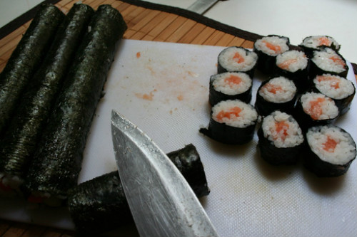 Una vez tengamos preparados todos los rollos, procedemos a cortarlos utilizando un cuchillo grande y bien afilado y una tabla de cortar. Tendremos a mano también un cuenco con agua, con en cual, con cuidado, mojamos la hoja del cuchillo cada 2 o 3 cortes, para evitar que el arroz se pegue al cuchillo, lo que podría dificultar la tarea de cortar. Cortamos los rollos en unos 8-10 trozos.