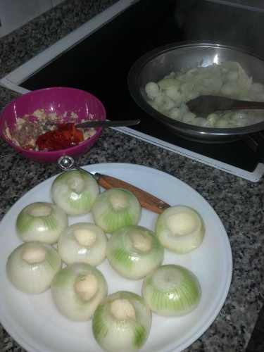 se limpian las cebollas y se ahuecan,lo que sale de ahuecarlas se pasa a una sarten con aceite de oliva.