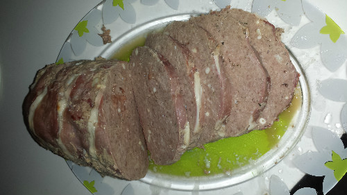Sacamos la carne del bol y hacemos una bola alargada con ella y la ponemos encima del jamón serrano. Colocamos el resto de lonchas de jamón serrano encima de la carne y cerramos el papel de aluminio sobre la carne.