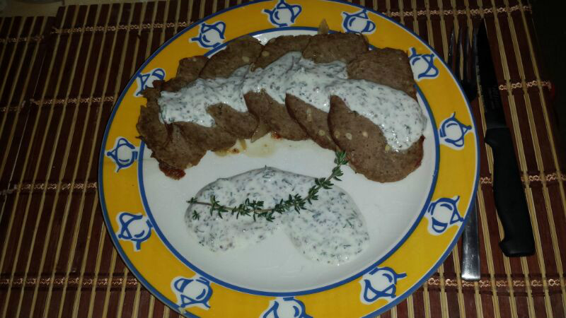 5 cucharadas de queso batido 0%, 1/2 cucharada de mostaza de Guijón, una buena cantidad de tomillo fresco, una buena cantidad de perejil, una buena cantidad de oregano, leche desnatada, sal y pimienta.