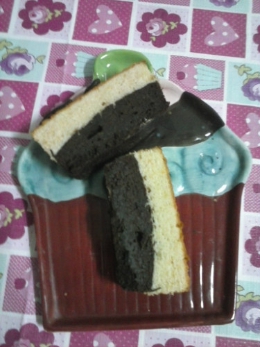 Mezclamos todo bien y añadimos al brownie que ya tenemos hecho. En mi caso, el brownie estaba hecho justo cuando acabe de preparar el bizcocho. Horneamos de nuevo hasta que veamos que el bizcocho está hecho.