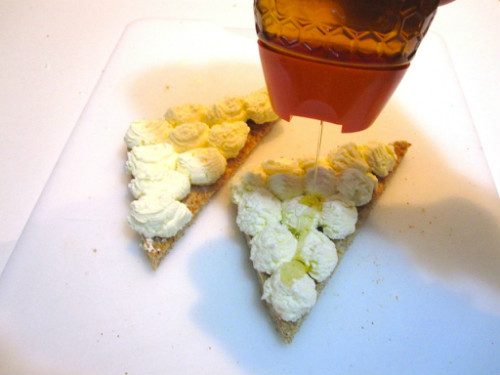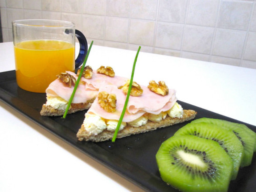 Añadimos unas gotas de miel y colocamos dos lonchas de pavo por rebanada, encima ponemos unas nueces peladas y unas gotas de aceite de oliva.