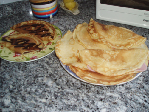 SE PONEN TODOS LOS INGREDIENTES EN UN BOL Y SE MESCLAN,LA MASA QUEDA MUY SUELTA COMO TIPO COLADA,LUEGO SE PONE UNA ZARTEN AL FUEGO Y A ESTA SE LE PONE UN POCO DE MANTEQUILLA,EN ESTE SE PONE UN CUCHARON DE ESTA MESCLA FORMANDO UNA ESPECIE DE TORTITA MEXICANA.SE DEJAN DORAR Y LISTO EL RELLENO ES DE VUESTRA ELECCION YO SUGERI JAMON,NUTELLA Y QUESO EN LONCHAS.
