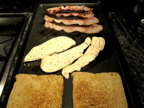 Marcamos en una plancha o sartén las rebanadas de pan Silueta para que queden un poco tostadas y hacemos los filetes de pollo y el bacon, reservamos en un plato.