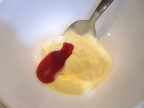 En un bol ponemos tres cucharadas de mahonesa y una pizca de ketchup y removemos.