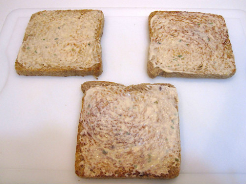 Le añadimos un poco de orégano y untamos bien tres rebanadas de pan Silueta. . A continuación colocamos en dos de ellas los demás ingredientes, la tercera rebanada la utilizaremos de tapa.
