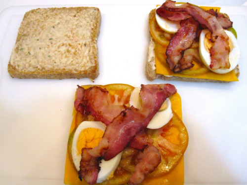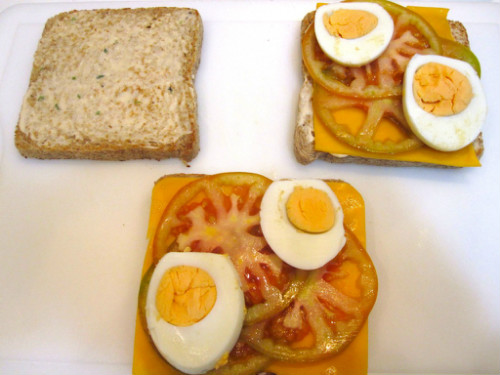 Empezamos poniendo una loncha de queso chedar en las dos rebanadas, luego el tomate y el huevo duro.