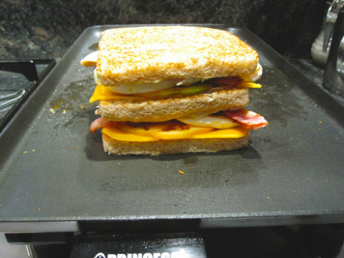 Ponemos una rebanada encima de otra y tapamos. Pasamos el sandwich otra vez por la plancha para que coja calor y cortamos en dos o cuatro trozos.