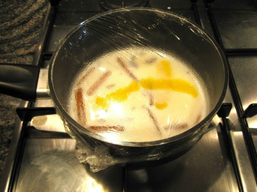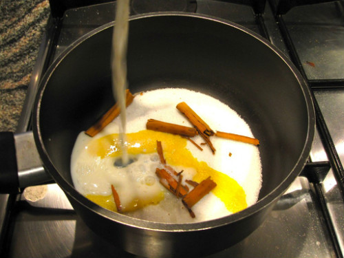 Ponemos en un cazo al fuego la leche, le añadimos la mitad del azúcar, la canela y la piel de limón.