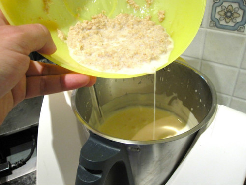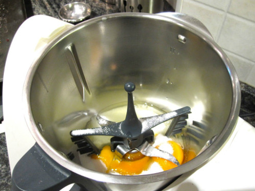 En el vaso de la Thermomix colocamos los dos huevos con el resto del azúcar unos cinco mitunos hasta que monte, utilizando el acople mariposa.