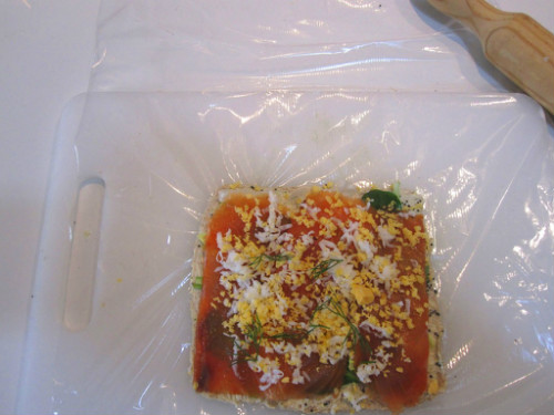 Con un pincel o cuchillo untamos la rebanada con la salsa y le añadimos un poco del mix de ensalada. Encima colocamos las lonchas de salmón, rallamos un poco de huevo duro y colocamos unas hojitas de eneldo.