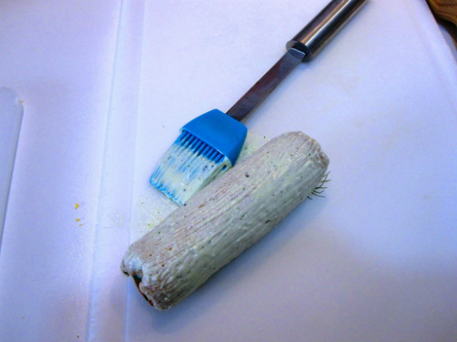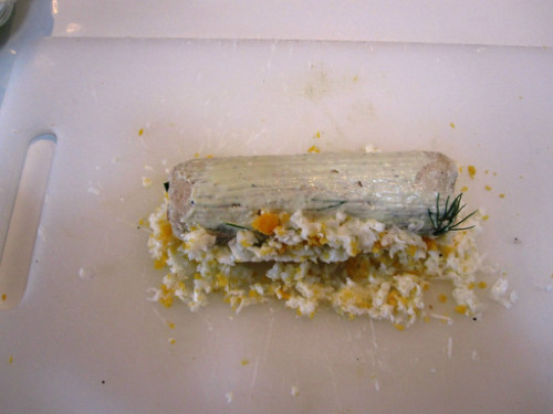 Con cuidado y con la ayuda del papel film enrollamos en forma de rulo. Una vez hecho el rulo lo pintamos con la salsa y lo pasamos por una capa fina de huevo duro rallado.