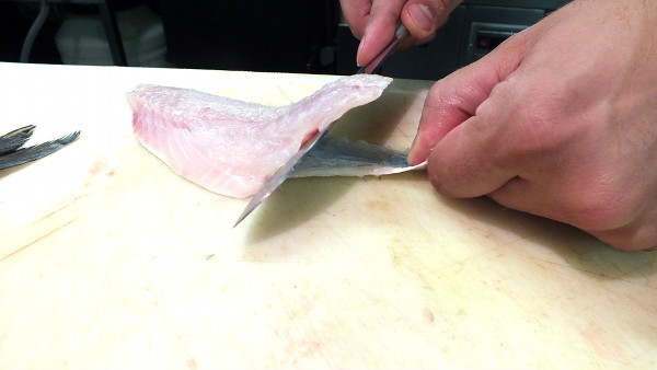 Para el pescado: limpiamos el pescado, sacamos los lomos y desespinamos. Porcionamos y quitamos la piel.