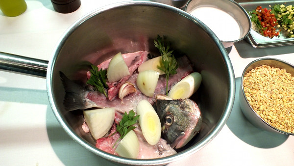 Para la salsa: en una cazuela con un poco de aceite y mantequilla rehogamos el apio y el blanco del puerro y le añadimos la cabeza y la espina de la dorada, cubrimos de agua y dejamos cocer 40 min. Colamos, añadimos la nata y dejamos reducir hasta conseguir la textura deseada y salpimentamos.