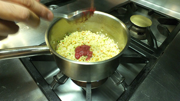 Para el arroz de trigo: en un cazo con aceite doramos a cuadritos las verduras, zanahoria, cebolla y calabacín. Añadimos el trigo y añadimos el doble de agua que de trigo y dejamos cocer 15 min. Cuando el grano está tierno añadimos la remolacha picada, mantecamos y ligamos el trigo
