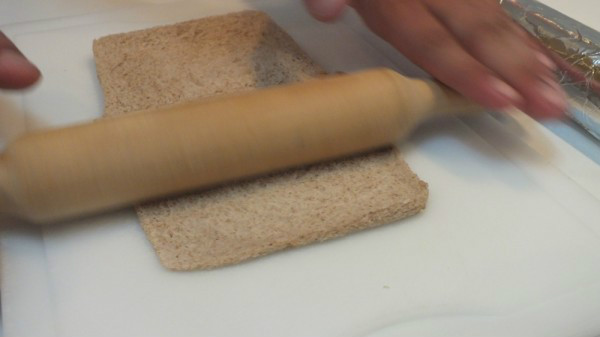 Para la tosta: Cogemos dos rebanadas de pan y con la ayuda de un rodillo las aplastamos hasta que queden finas y juntas.
