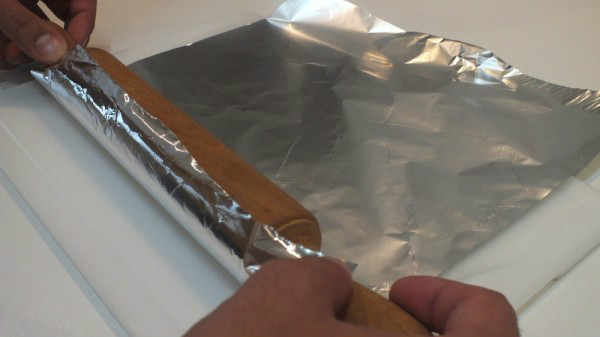 Luego para que coja la forma que queremos darle al pan envolvemos el rodillo con papel de plata para que no se queme.