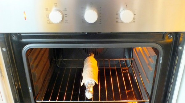 Introducimos en el horno el rodillo con el pan encima para que tome la forma y lo dejamos 15min en el horno a 100 grados hasta que este crujiente.