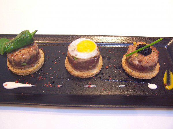 Hacemos con un molde o con la mano las mini hamburguesas y pasamos por la plancha vuelta y vuelta, dejando marcado los dos lados de la hamburguesa y el centro totalmente crudo.