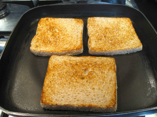 Cogemos las rebanadas de pan integral Silueta y las tostamos un poco en una sartén o plancha.