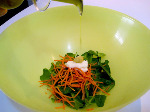 En un bol metemos los canónigos, la zanahoria rallada y mezclamos bien con la mahonesa, una pizca de mostaza y unas gotas de aceite de oliva.