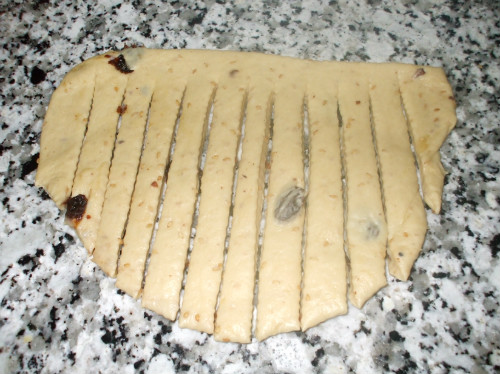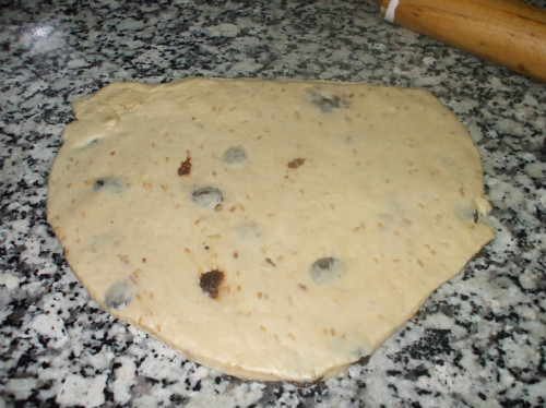 En un bol, ponemos en este orden, el agua, el aceite, las pasas, la harina, la levadura y la sal,amasamos hasta conseguir una masa suave y elástica, la tapamos y dejamos fermentar, el tiempo de fermentación varía dependiendo de la temperatura ambiental,estará lista cuando veamos que ha doblado su volumen.