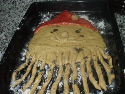 Con una brocha de cocina lo pintamos con el huevo batido, lo metemos en el horno precalentado a 180º hasta que el pan este dorado.