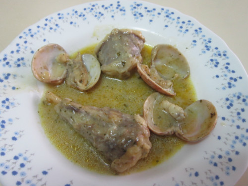 A CONTINUACION, LAVAMOS BIEN LAS ALMEJAS, Y EN UNA SARTEN, CON UN POCO DE AGUA LAS ABRIMOS, Y RESERVAMOS EL AGUA DE ABRIRLAS,COLADO. UNA VEZ ABIERTAS, LAS VAMOS COLOCANDO, CON CUIDADO, SOBRE LAS TAJADAS DE PIXIN.