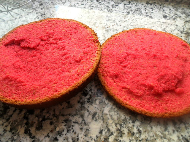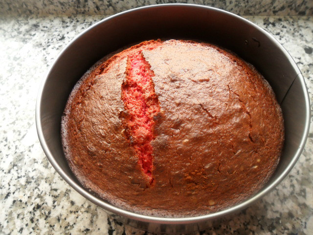 Cuando el bizcocho, este totalmente frio, lo cortamos en dos partes para sacar tres discos.