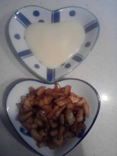 En una sarten con una nuez de mantequilla saltearemos la manzana que habremos pelado y picado pequeñita y a la que añadiremos un poco de azucar moreno, cuando este bien pochadita la reservamos,