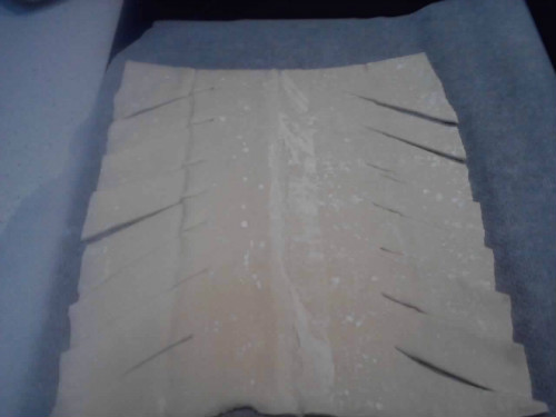 Lo primero que hemos de hacer es cuadrarla e imaginariamente dividirla en tres porciones a lo largo, la del centro la dejaremos para rellenar y a las dos laterales le haremos unos cortes para poder trenzarla.