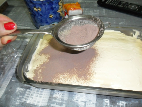 Sacar de la nevera y con ayuda de un colador , espolvorear el cacao cubriendo la superficie, volver a meter a la nevera hasta el momento de servir
